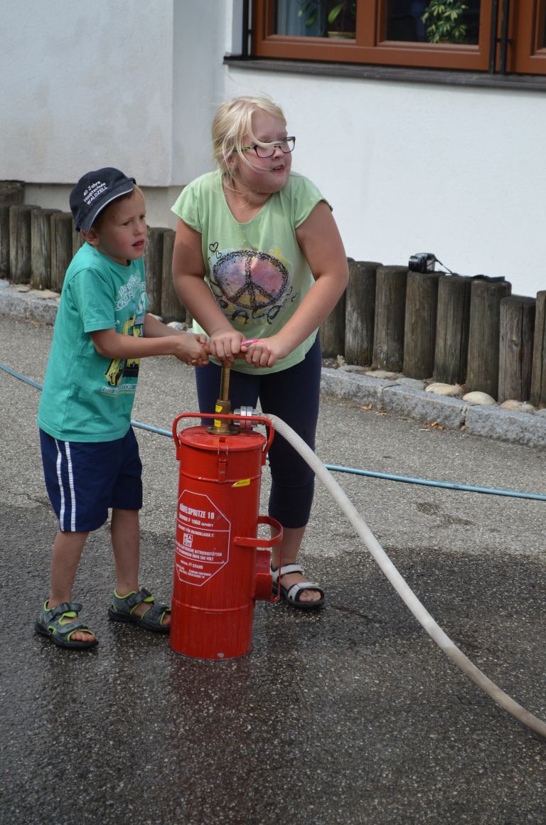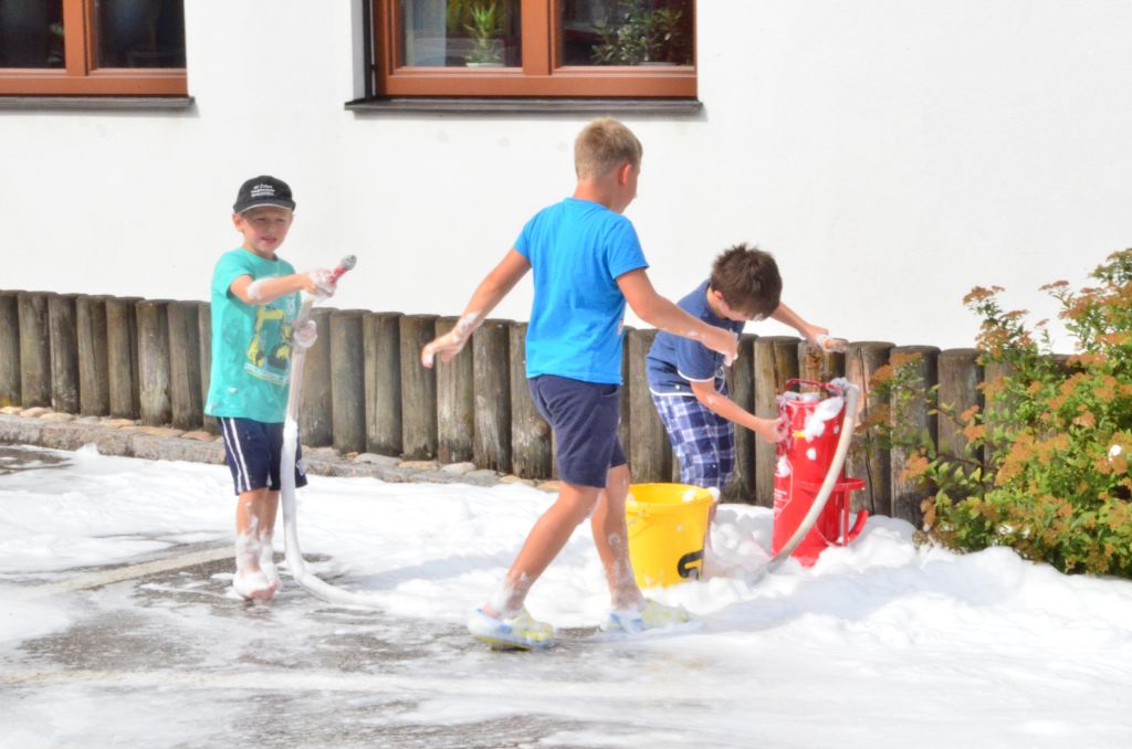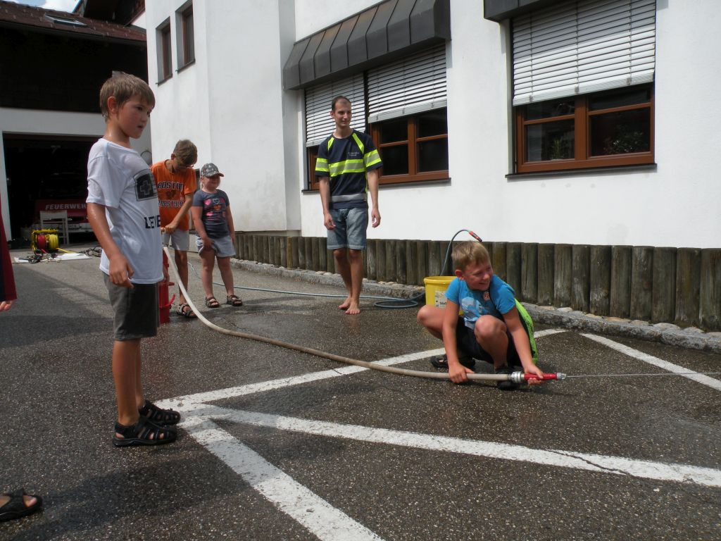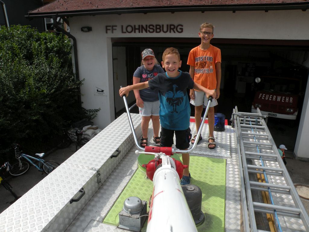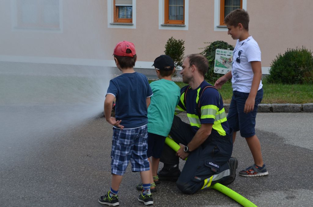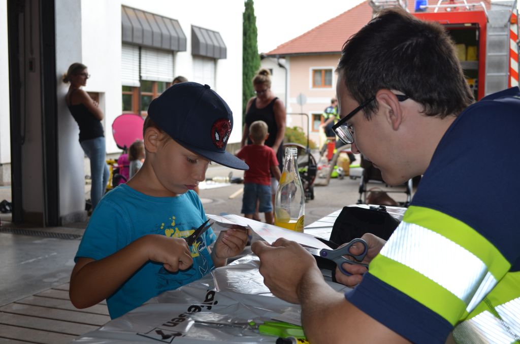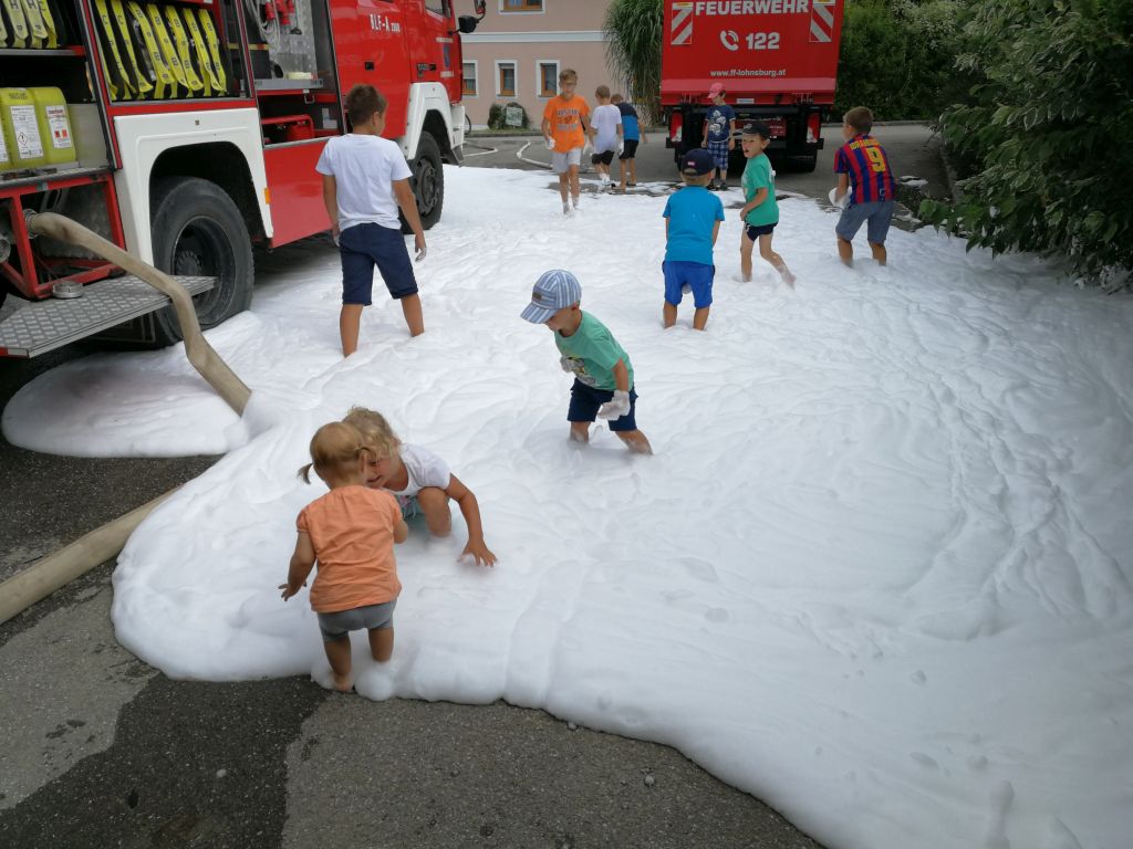 Neben den klassischen Rundfahrten mit unserem Oldtimer konnten die Kinder mit der Kübelspritze auf das „Brandhaus“ spritzen, mit dem hydraulischen Rettungsgeräte arbeiten, mit den diversen Strahlrohren spritzen, Feuerwehrautos basteln in allen Fahrzeugen Probesitzen, Funken und vieles mehr. Zum Abschluss wurde noch eine Schaumparty veranstaltet und die hungrigen Mägen mit Bosna gefüllt.