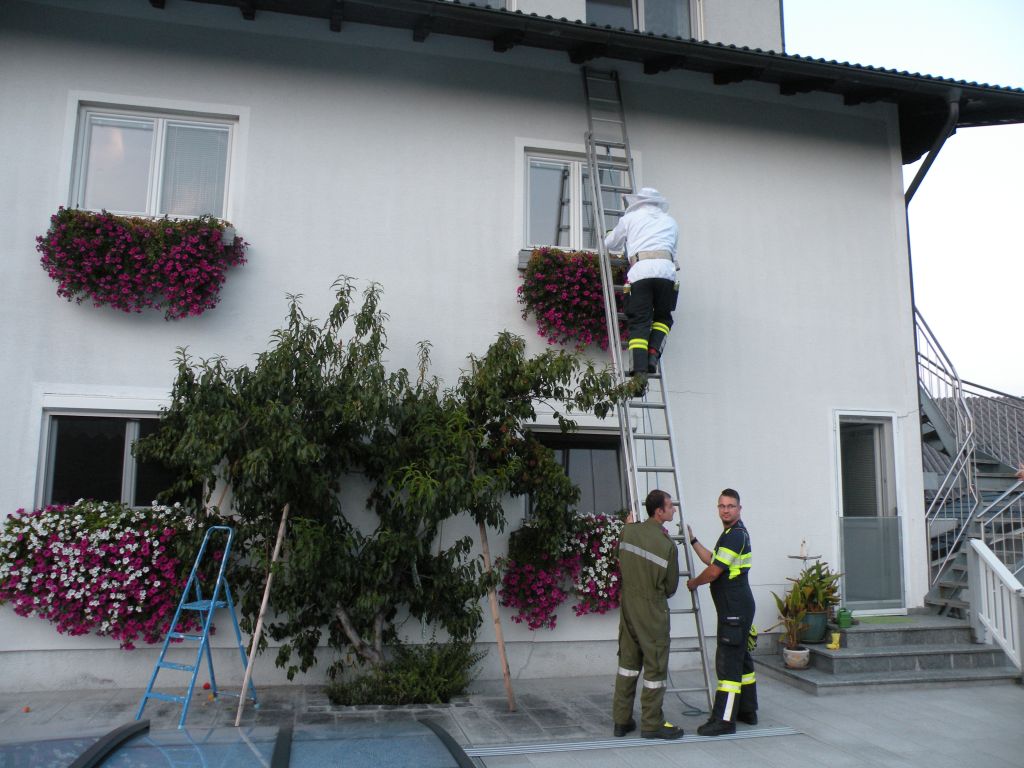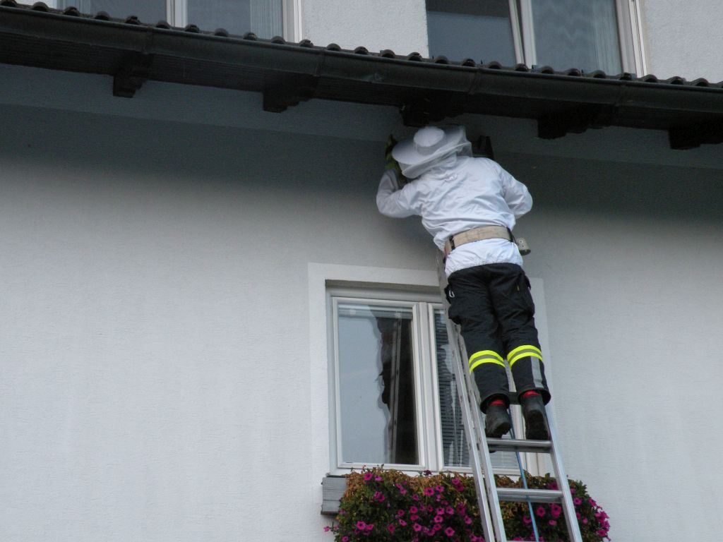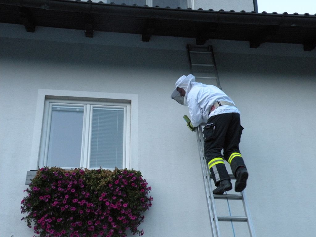 Auf Grund der Lage des Nestes im Dachstuhl musste der Schaum mittels Ausziehleiter aufgebracht werden.